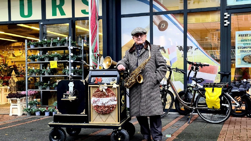Met deze mobiele versterking op batterijen kan hij op eender welke locatie optreden en kan men genieten van aangename muziek.